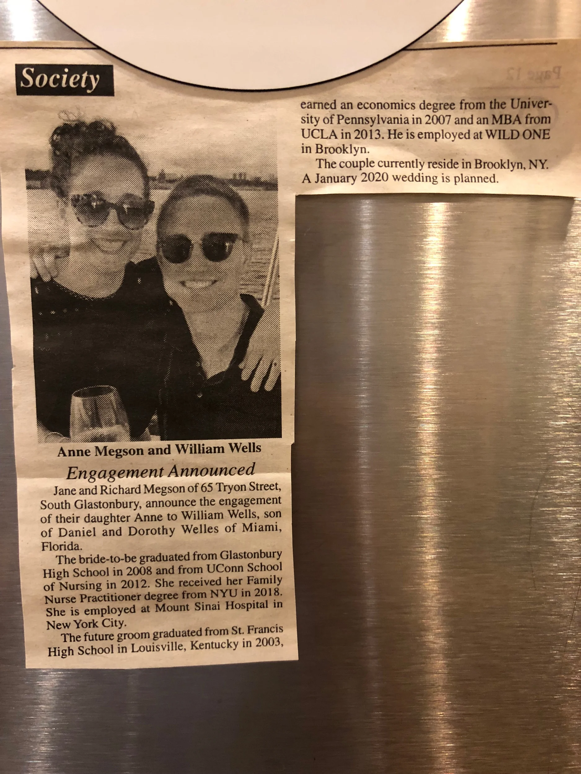 On Page 11 of the Society Pages of the esteemed daily publication, The Glastonbury Citizen, the engagement of Anne Megson and William Wells was herewith announced to the world.